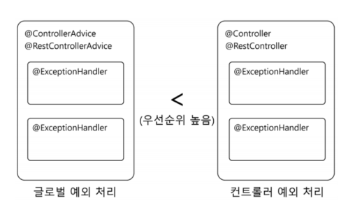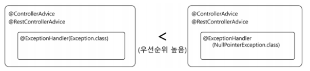 만약, @ControllerAdvice와 컨트롤러 내에 동일한 예외 타입을 처리한다면 좀 더 우선순위가 높은 클래스 내의 핸들러 메서드가 사용되는 것을 볼 수 있다.
