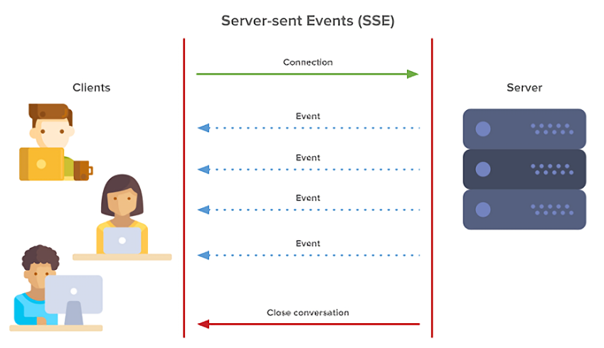 - WebSocket과 같이 양방향이 아닌 Server→ Client 단방향이기 때문에 서버의 event나 message를 client로 push 하는 작업에 유용하게 사용될 수 있다.