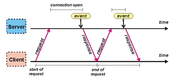 - 서버에 응답에 대한 사용 가능한 데이터가 없으면(이벤트가 없으면) 계속 기다리다가 서버에서 해당 클라이언트로 전달할 이벤트가 있다면 그 순간 response 메시지를 전달하면서 연결이 종료된다.