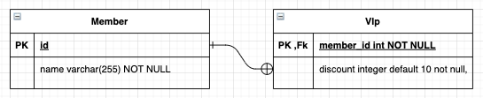 Member 테이블과 Memeber의 id를 외래키이자 기본키로 가지는 Vip 테이블이 있다.