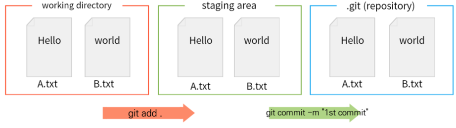 - 즉, 작업 공간에서 발생한 상태 변화는 스테이징 영역으로 이동했을 때만 깃으로 변경 사항을 기록한다.