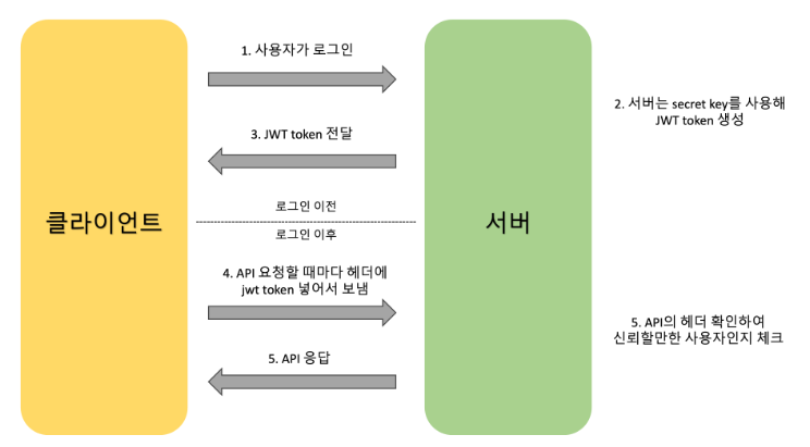 - 서버는 비밀키를 사용해 JSON 객체를 암호화한 JWT 토큰을 발급한다.
