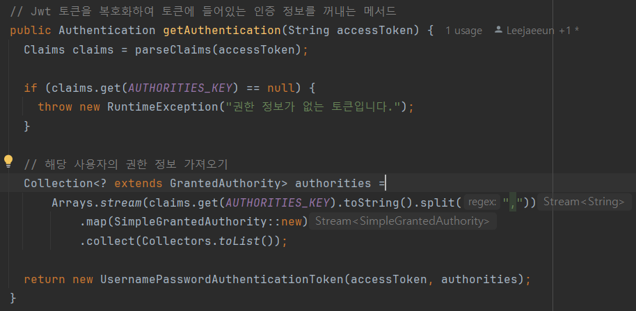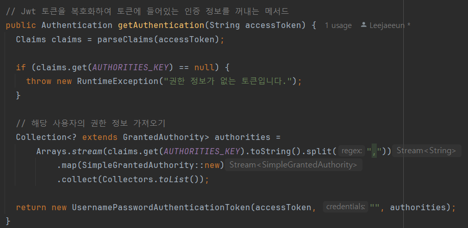 디버깅을 하면서 객체의 값을 따라가고 있는 도중에 jwtTokenProvider에서 getAuthentication(token) 메서드를 실행했을 때 생성된 Authentication 객체는 Authenticated = false 로 인증이 되어 있지 않고 Granted Authorities 에 null이 들어있는 것을 알 수 있었다.