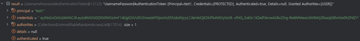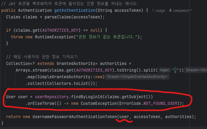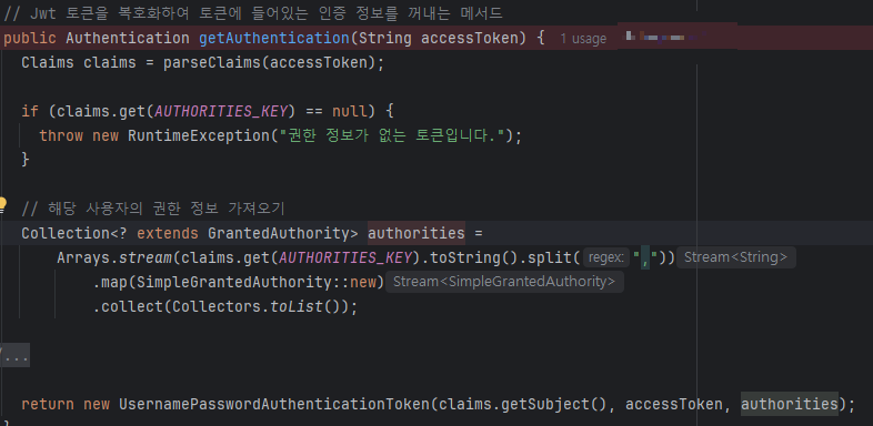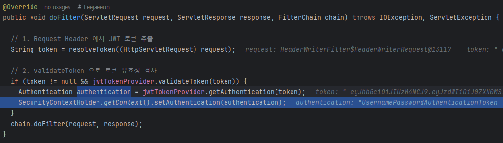 위의 과정에서 jwtTokenProvider.getAuthentication(token); 을 통해 생성된 authentication 객체에