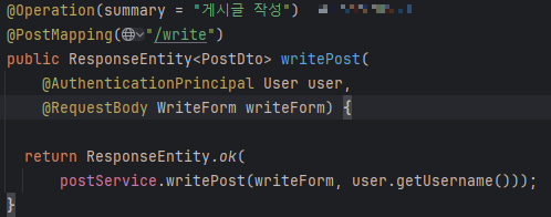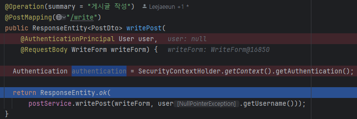 자꾸 @AuthenticationPrincipal 어노테이션에 null 값이 들어와 NullPointerException 에러가 발생하는 것이였다.