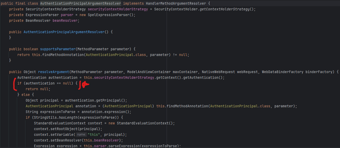 이 어노테이션이 붙은 파라미터에 값을 주입해주는 AuthenticationPrincipalArgumentResolver를 들어갔다.
