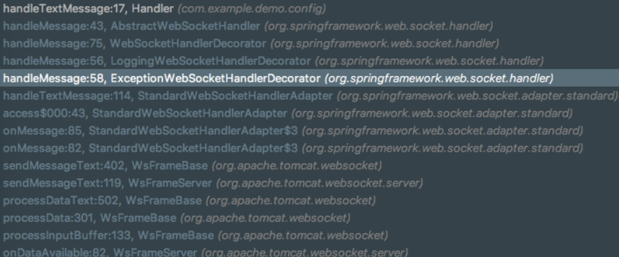 아래 사진은 실제로 Spring에 등록된 WebSocketHandlerDecorator 구현체들이며, 연속적으로 전파되어 실행되는 것을 확인할 수 있다.