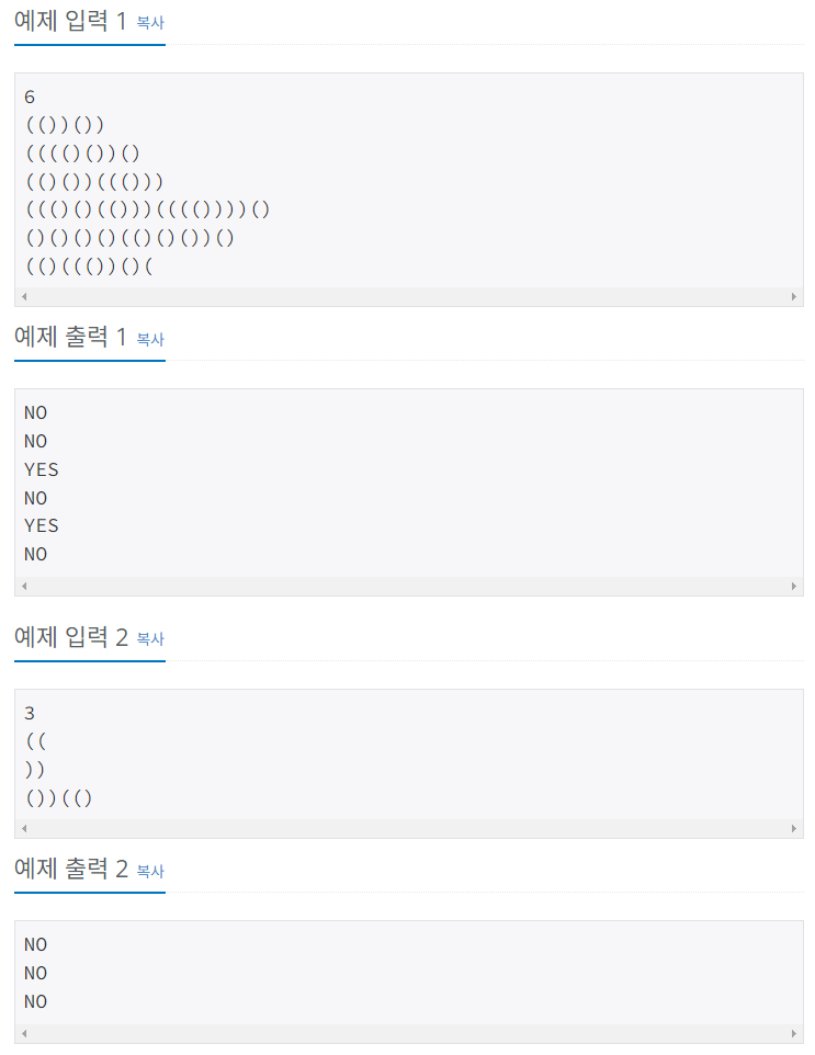 괄호 문자열(Parenthesis String, PS)은 두 개의 괄호 기호인 ‘(’ 와 ‘)’ 만으로 구성되어 있는 문자열이다. 그 중에서 괄호의 모양이 바르게 구성된 문자열을 올바른 괄호 문자열(Valid PS, VPS)이라고