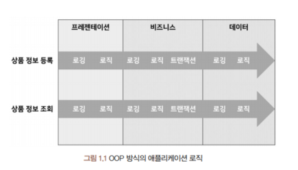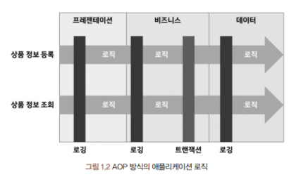 - '부가 기능'은 핵심 기능인 비즈니스 로직 사이에 로깅 처리를 하거나 트랜잭션을 처리한느 코드를 예로 들 수 있다.
