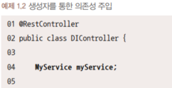 - 사용할 객체를 직접 생성하지 않고 외부 컨테이너가 생성한 객체를 주입 받아 사용하는 방식을 의미한다.