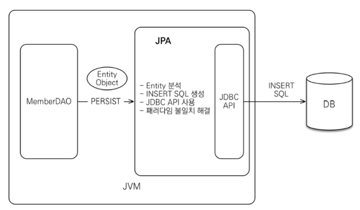 - 개발자가 JPA를 사용하면, JPA 내부에서 JDBC API를 사용하여 SQL을 호출하여 DB와 통신한다.