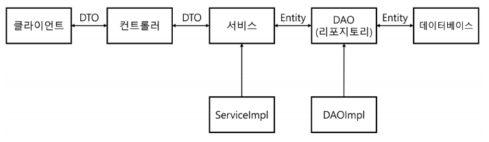 - DAO 클래스는 의존성 결합을 낮추기 위한 디자인 패턴이며, 서비스 레이어에 DAO 객체를 주입받을 때 인터페이스를 선언하는 방식으로 구성할 수 있다.
