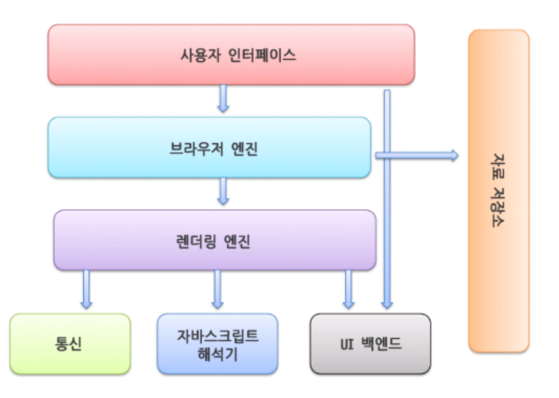 - 브라우저 엔진 - 사용자 인터페이스와 렌더링 엔진 사이의 동작을 제어