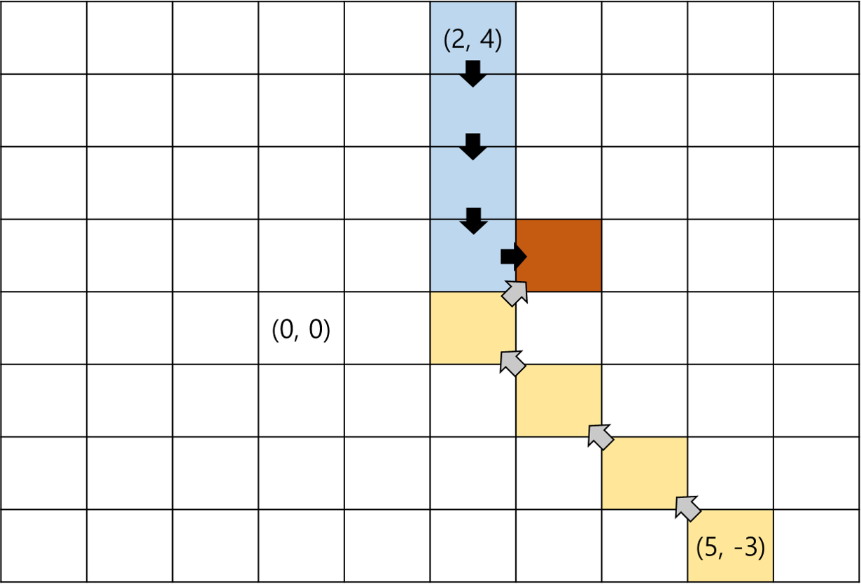 문제철수와 영희는 눈을 가리고 잡기 놀이를 하기로 했다.철수는 도망치는 역할을 맡았으며, (x1, y1) 좌표에서 출발한다.매 1초마다 철수는 동/서/남/북 중 한군데를 임의로 선택하여 이동한다.영희는 철수를 잡는 역할을 맡았으며, (x2, y2) 좌표에서 출발한다.매 1초마다 영희는 북서/북동/남서/남동 중 한군데를 임의로 선택하여 이동한다.모든 경우 중에서, 영희가 철수를 가장 빨리 잡는 경우 몇 초의 시간이 걸리는지 출력하시오.입력설명-1000 -1000 -1000 -1000 출력설명영희가 철수를 가장 빨리 잡았을 때의 소요 시간(초)를 정수로 출력매개변수 형식x1 = 2y1 = 4x2 = 5y2 = -3반환값 형식4예시 입출력 설명아래와 같이 움직일 경우, 4초 후에 영희가 철수를 잡을 수 있다...